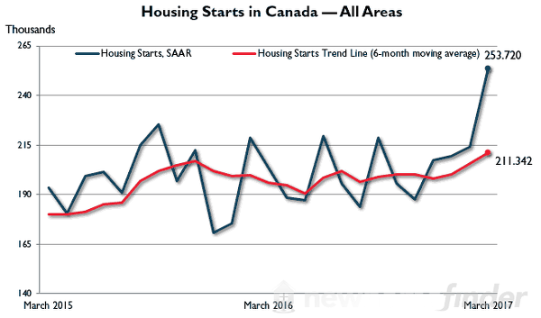 Housing starts continue their trend higher at 22,342 units in March 2017 according to Canada Mortgage and Housing Corporation (CMHC).